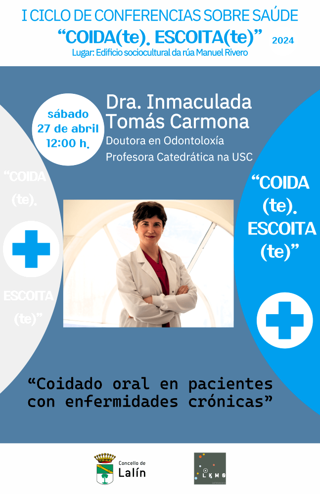 O vindeiro relatorio co que continuará o “I Ciclo de Conferencias sobre Saúde “Cóida(te). Escóita(te)” que promove o goberno a través da Concellería de Sanidade e Hábitos Saudables e que está a ter unha excelente acollida por parte da veciñanza é a da doutora en Odontoloxía, catedrática en Estomatoloxía na USC e coordinadora do Servizo Universitario de Atención Odontolóxica en Pacientes con Necesidades Especiais, Inmaculada Tomás Carmona.