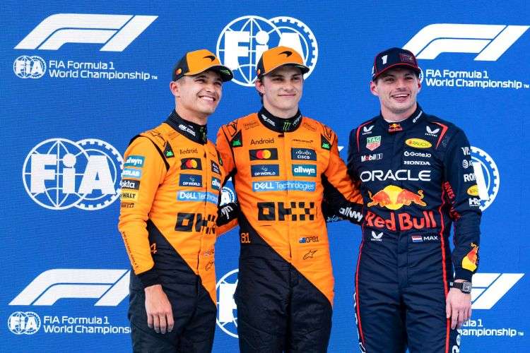 (de i. a d.) El piloto británico del equipo McLaren Lando Norris, líder del Mundial de Fórmula Uno; su compañero australiano Oscar Piastri -segundo en la general- y el cuádruple campeón del mundo neerlandés del equipo Oracle Red Bull Racing Max Verstappen -tercero en el certamen- en una imagen de archivo durante el pasado Gran Premio de España, en el circuito de Barcelona-Cataluña, en Montmeló (Barcelona). EFE/Siu Wu