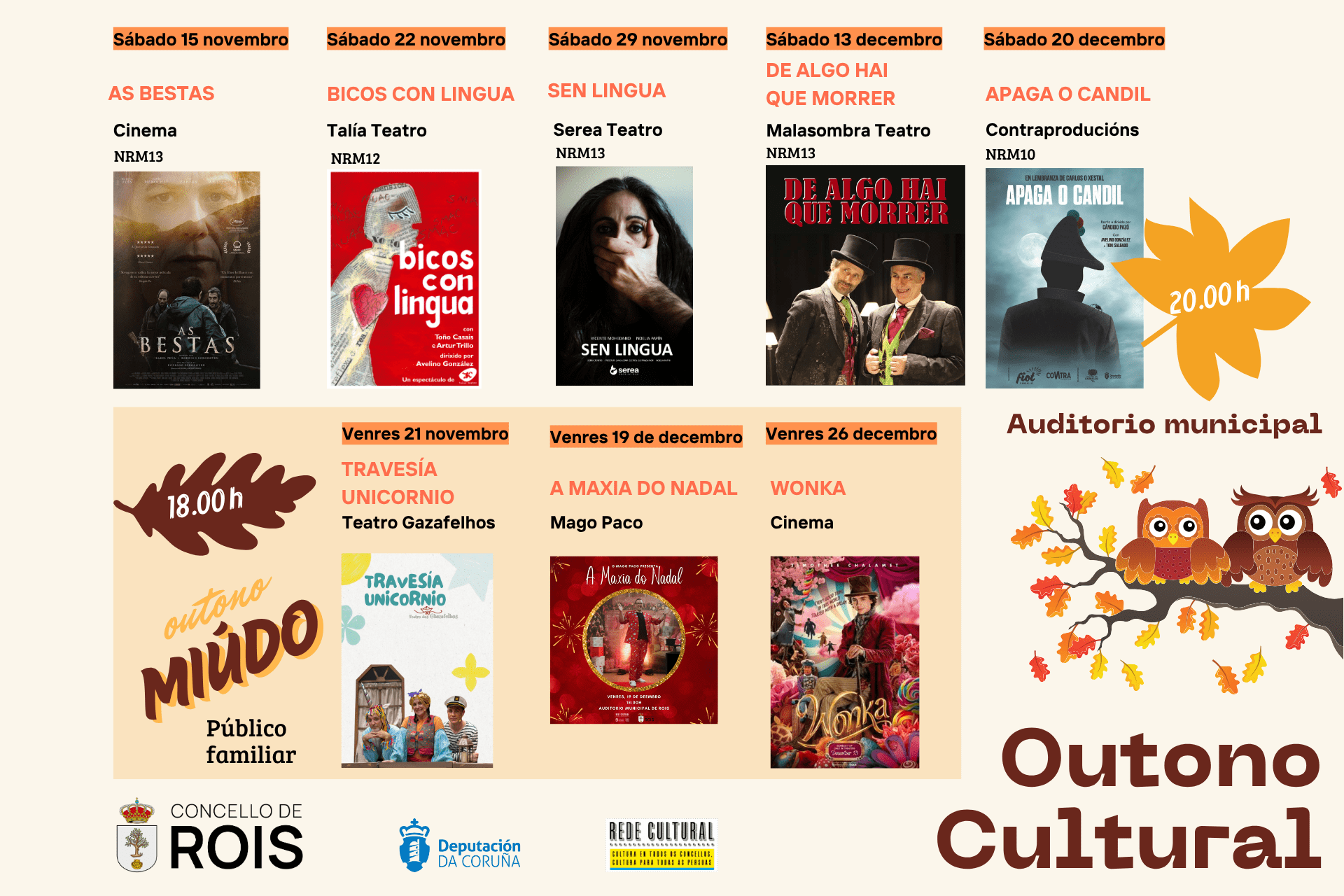 O Concello de Rois presenta a súa programación do Outono Cultural 2025, unha completa oferta de espectáculos de cinema, teatro e maxia pensados para diversos públicos, que se desenvolverán durante os meses de novembro e decembro no Auditorio Municipal. Todos os eventos son de entrada libre ata completar aforo.