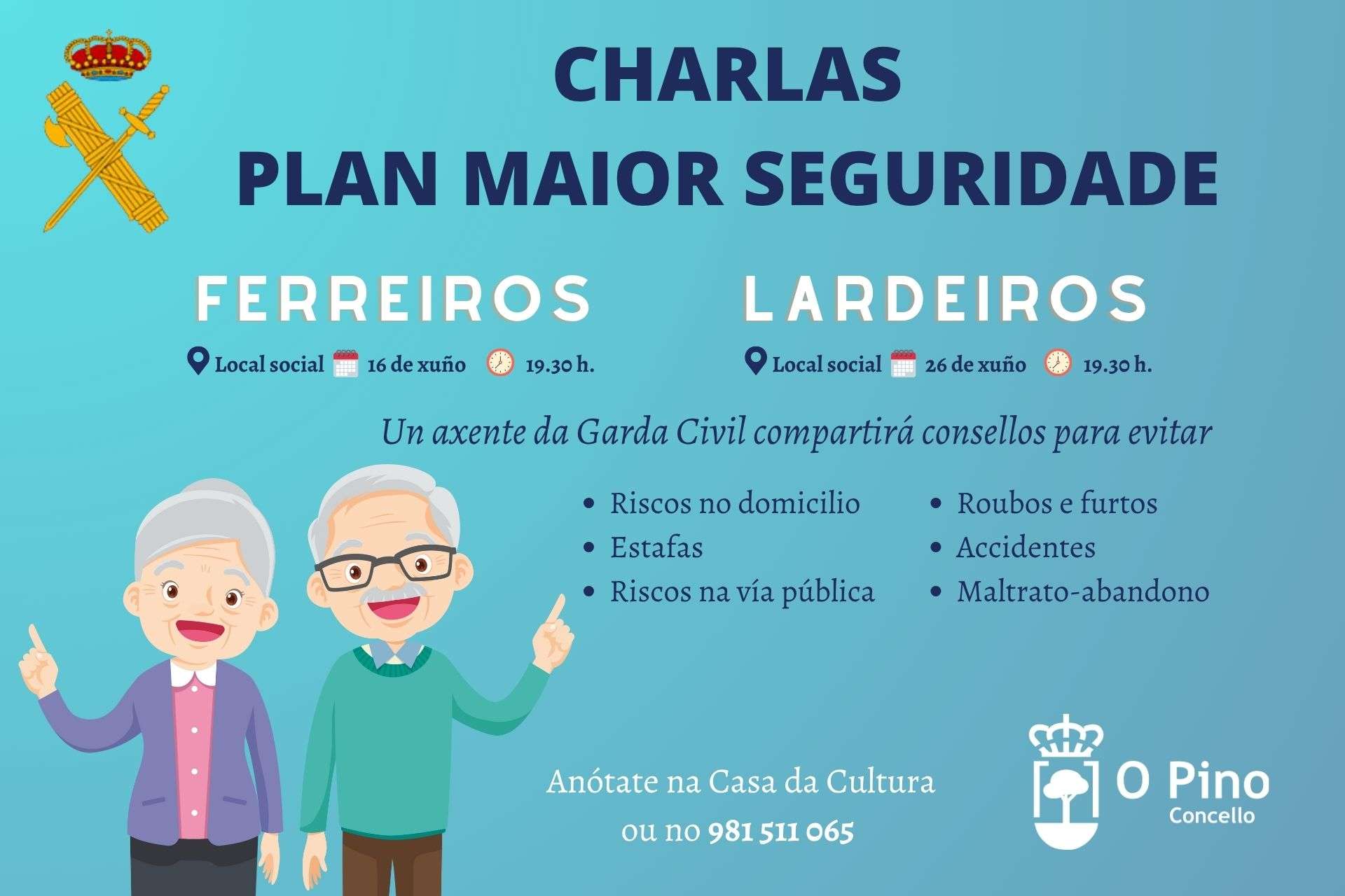 O Concello do Pino impulsa este mes de xuño dúas sesións informativas dirixidas á poboación maior no marco do Plan Maior Seguridade, unha iniciativa da Garda Civil que busca previr riscos e promover o benestar deste colectivo. As charlas terán lugar nos locais sociais das parroquias de Ferreiros e Lardeiros, os días 16 e 26 de xuño, respectivamente, ambas en horario de 19:30 horas.