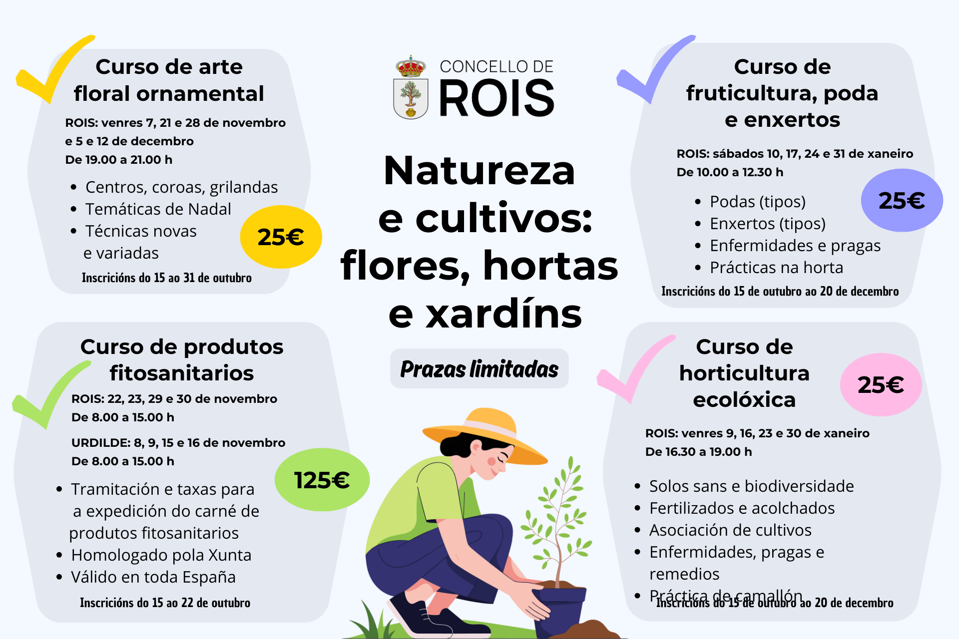 O Concello de Rois pon en marcha un novo ciclo formativo baixo o título “Natureza e cultivos: flores, hortas e xardíns”, que pretende fomentar o respecto polo medio natural e promover prácticas sostibles entre a veciñanza. A iniciativa inclúe catro cursos prácticos que se celebrarán entre novembro e xaneiro e abordan diferentes ámbitos, desde a arte floral e o uso responsable de produtos fitosanitarios ata a fruticultura e a horticultura ecolóxica. As inscricións estarán abertas a partir do mércores 15 de outubro.