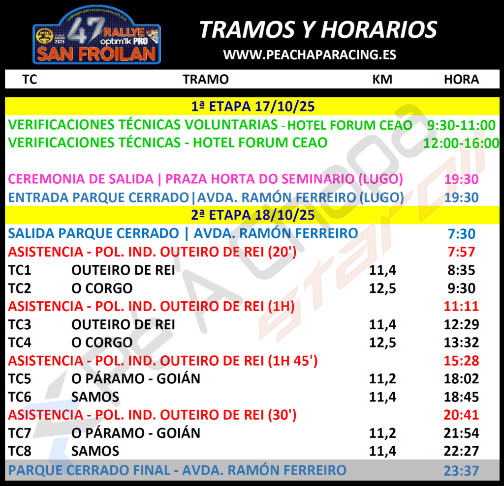 O Rally comezará coa cerimonia de saída, que se celebrará o venres 17 ás 19.30 horas na Praza da Horta do Seminario. A disputa dos treitos concentrarase o sábado, segundo a cronoloxía adxunta.