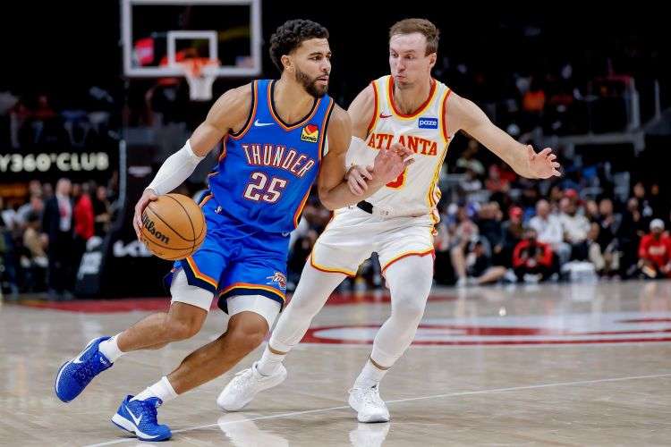 El base de Oklahoma City Thunder, Ajay Mitchell (i), en acción contra el base de Atlanta Hawks, Luke Kennard (D), durante un partido de baloncesto de la NBA este 25 de octubre de 2025. EFE/EPA/ERIK S. LESSER SHUTTERSTOCK OUT