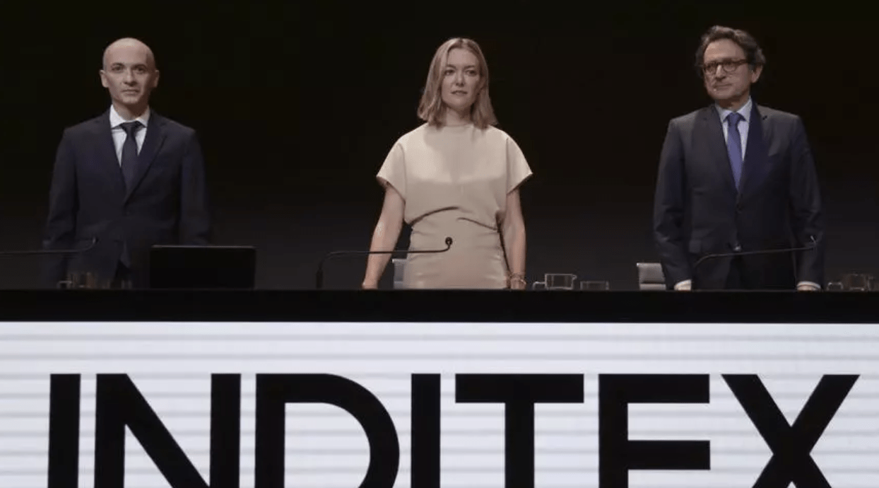 Imagen del pasado 9/7/24 de la presidenta de Inditex, Marta Ortega (c), acompañada por el consejero delegado de la multinacional, Óscar García Maceiras (i), durante la Junta General de Accionistas que la cadena textil celebró en el concello coruñés de Arteixo. Foto: EFE/Cabalar.