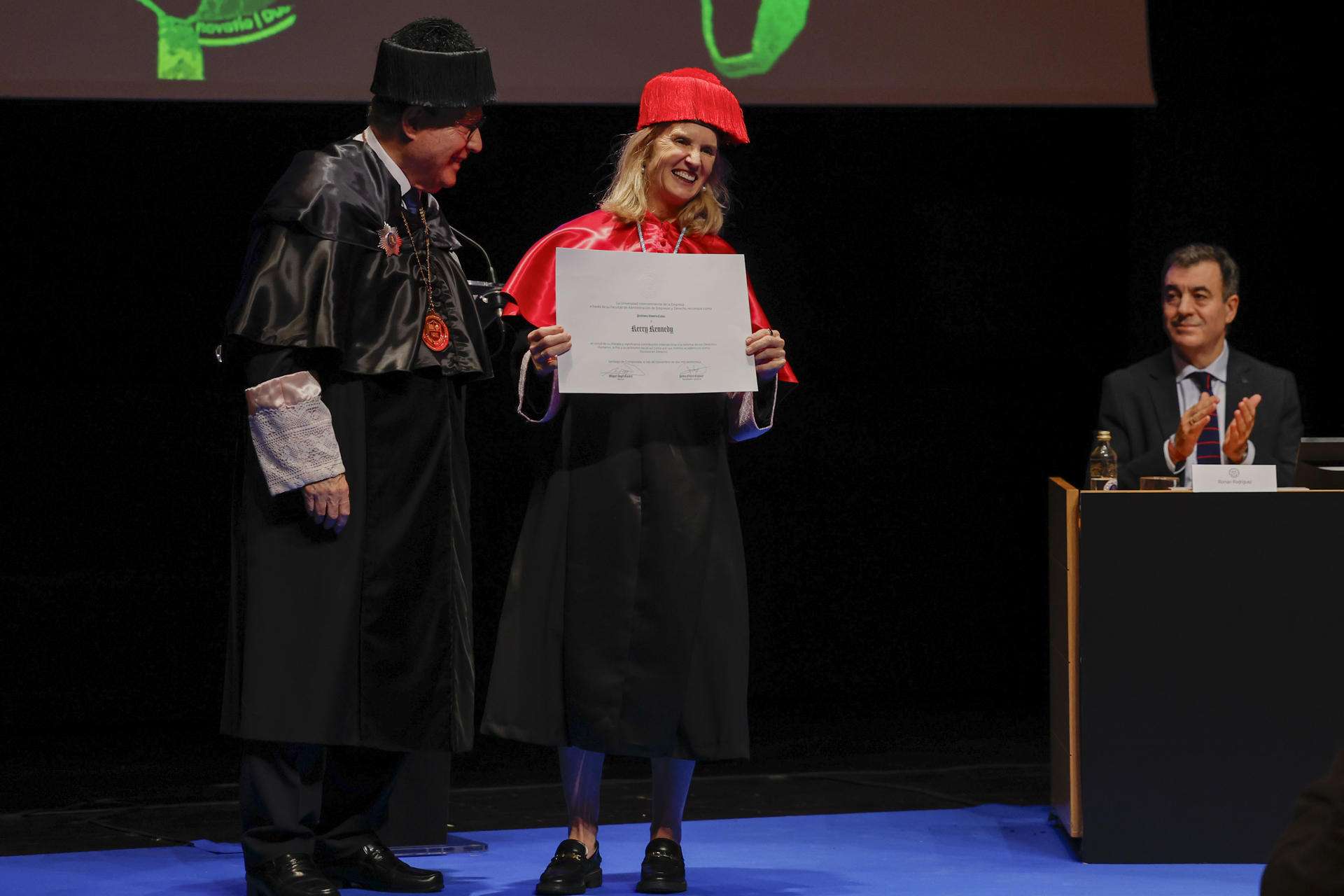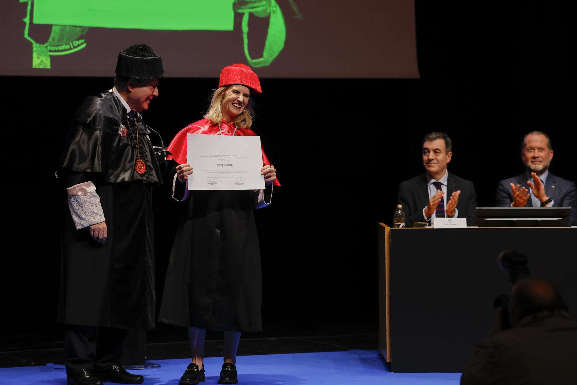 Al acto de nombramiento de Kerry Kennedy como profesora honoris causa por la UIE han asistido el presidente del Parlamento de Galicia, Miguel Santalices, y los conselleiros de Educación y Facenda de la Xunta de Galicia, Román Rodríguez y Miguel Corgos respectivamente.