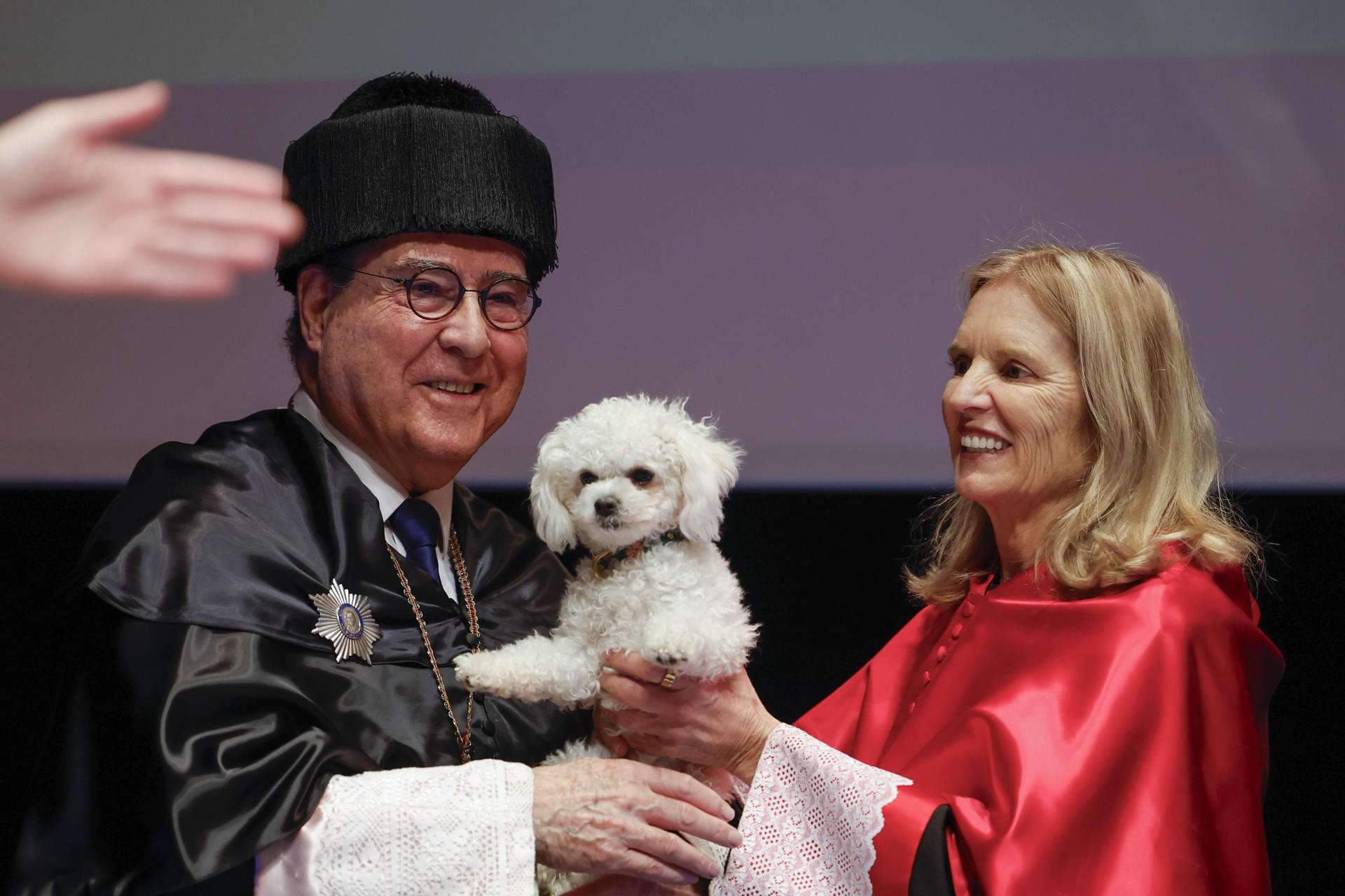 La presidenta de la Fundación Robert F. Kennedy Human Rights Kerry Kennedy, entrega su perrito que le acompañó en el acto, antes de recibir de manos del presidente de Afundación y rector de la UIEA, Miguel Ángel Escotet (izq), el titulo de Dra. Honoris causa por la Universidad Intercontinental de la Empresa de Abanca (UIEA), hoy lunes en Santiago de Compostela. EFE/Lavandeira Jr