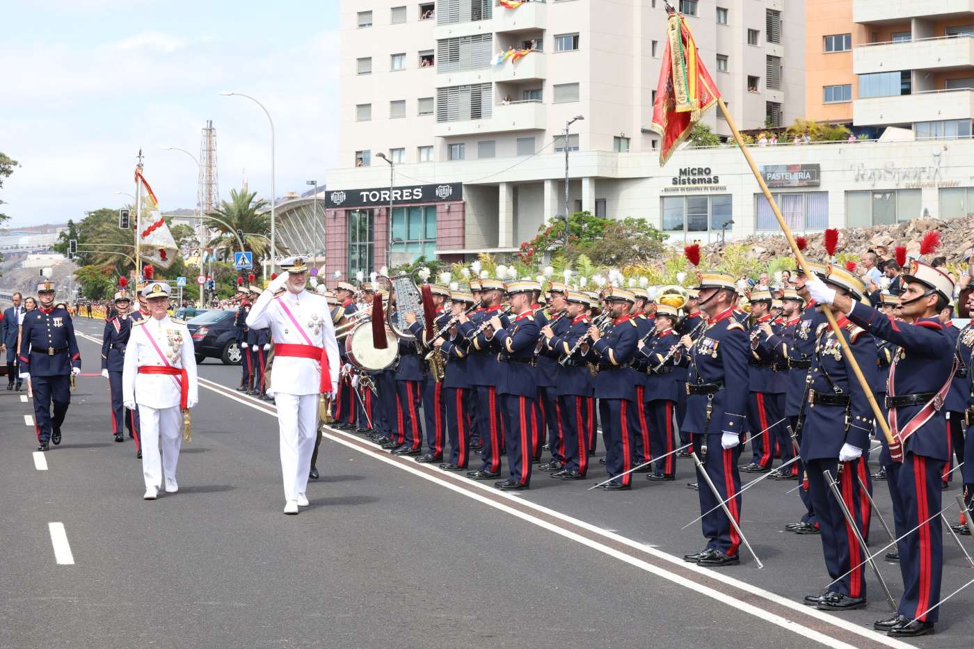 La jornada comenzó con la llegada de Sus Majestades a la avenida de la Constitución, donde fueron recibidos por el presidente del Gobierno de Canarias, Fernando Clavijo, y la ministra de Defensa, Margarita Robles. También les saludaron el alcalde de Santa Cruz de Tenerife, José Manuel Bermúdez Esparza, y el jefe del Estado Mayor de la Defensa, almirante general Teodoro Esteban López Calderón.