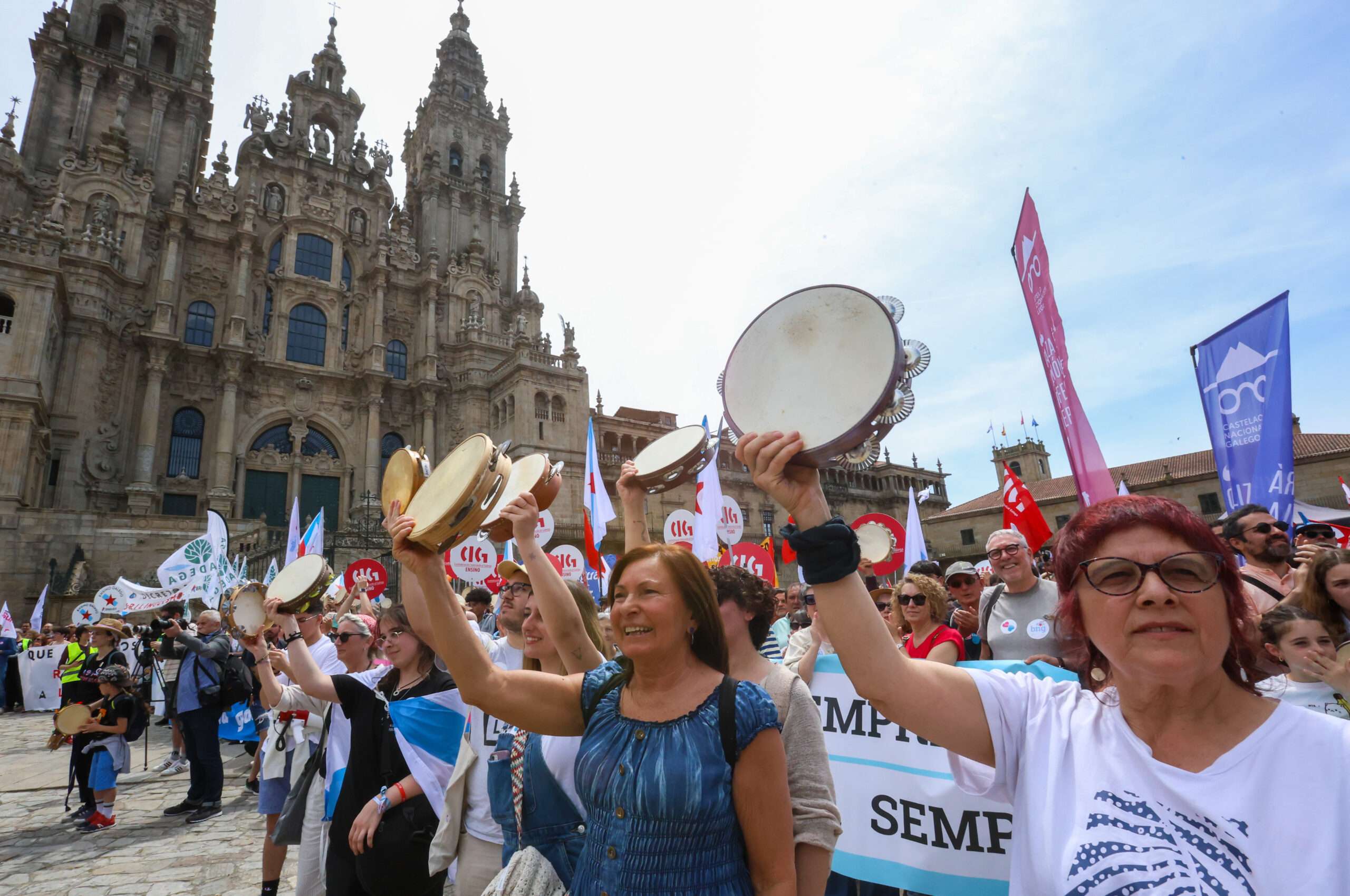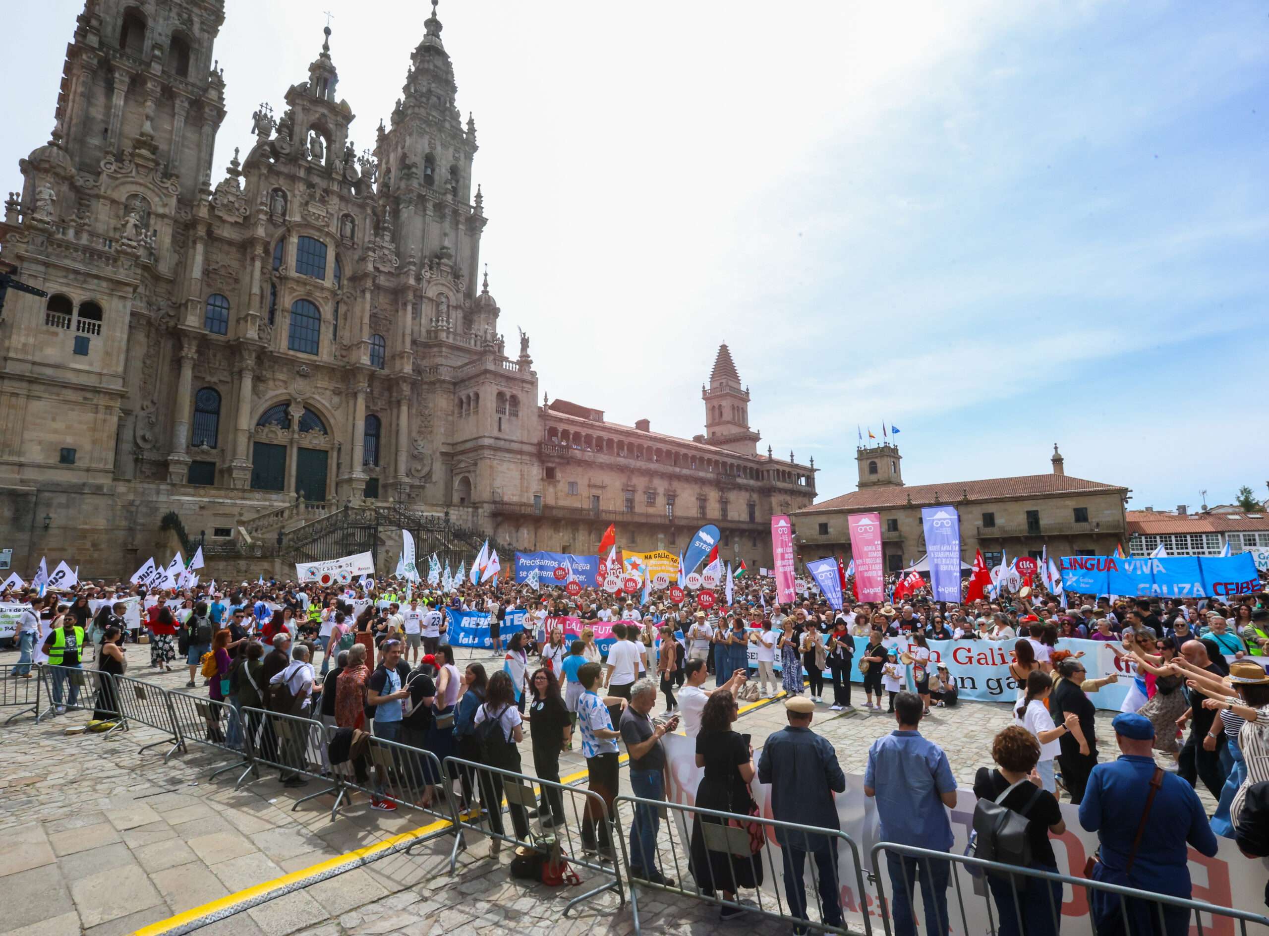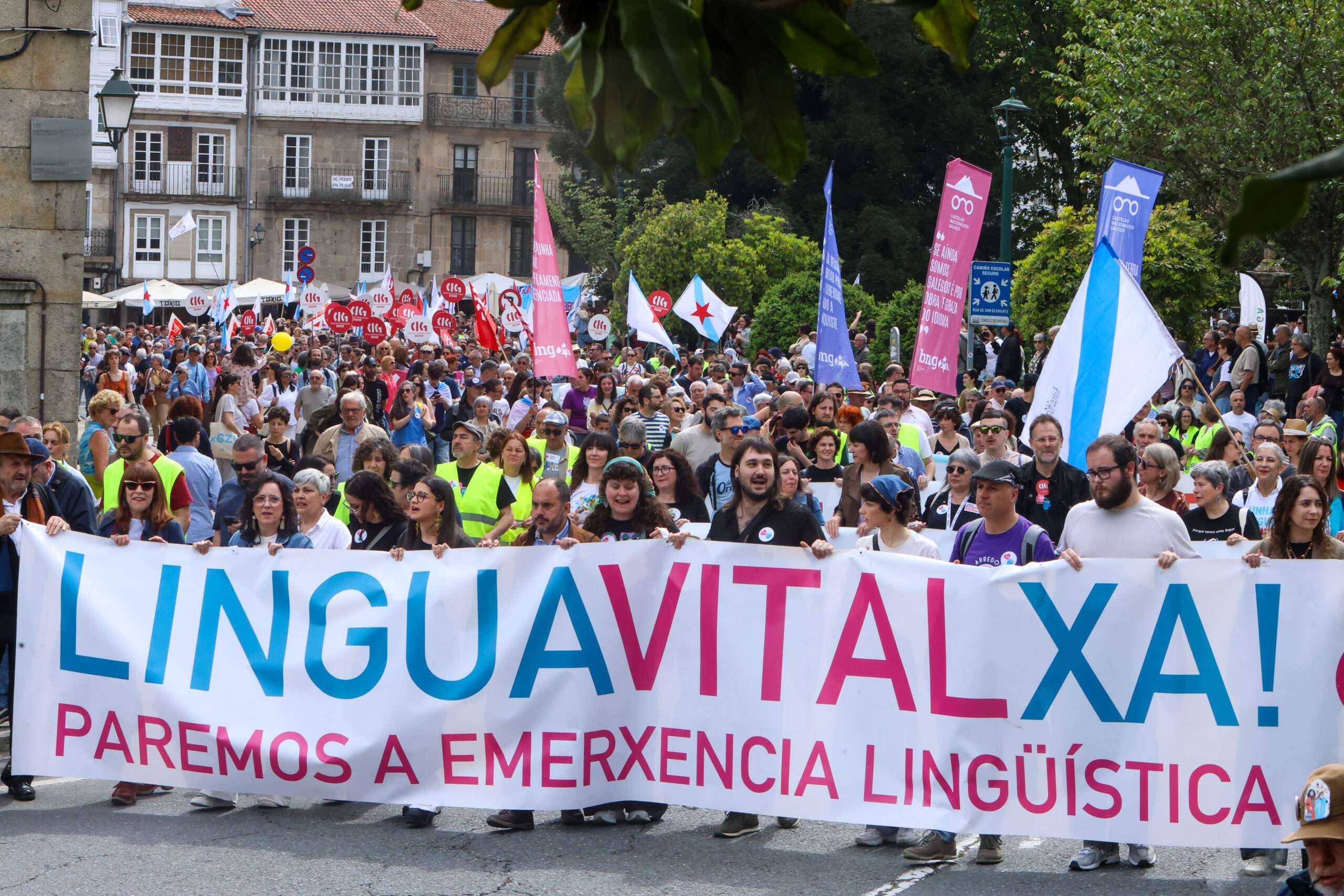 Miles de persoas saíron este sábado, 17 de maio, ás rúas de Santiago de Compostela convocadas pola plataforma Queremos Galego para esixir «unha Galicia en galego» e reverter a «emerxencia lingüística» que reflicten os últimos datos sobre o uso e competencias do idioma.