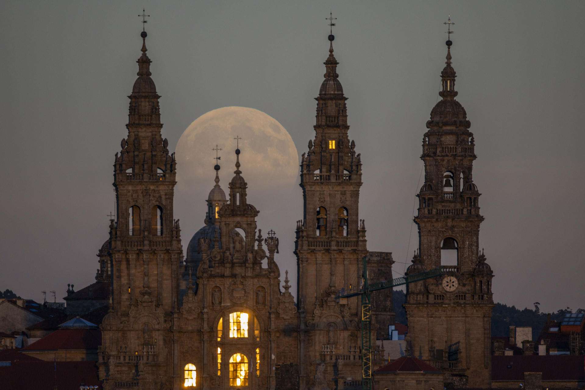 La Luna llena sale sobre la catedral de Santiago de Compostela. La primera luna llena del otoño astronómico recibe el nombre de "Luna de la cosecha" o "del cazador". EFE/Lavandeira jr