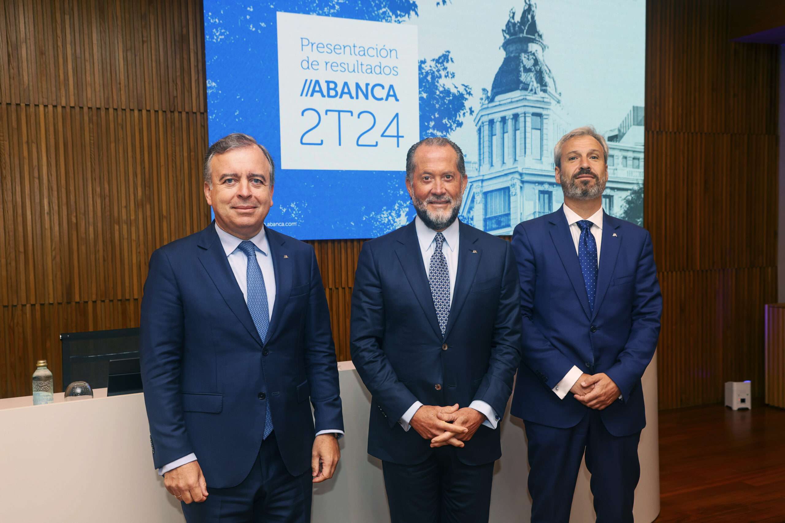 El presidente de ABANCA Juan Carlos Escotet (c); el consejero delegado Francisco Botas (i) y el director general Financiero Alberto de Francisco, han presentado esta mañana los resultados del primer semestre de 2024. Foto: EFE/ Xoán Rey.