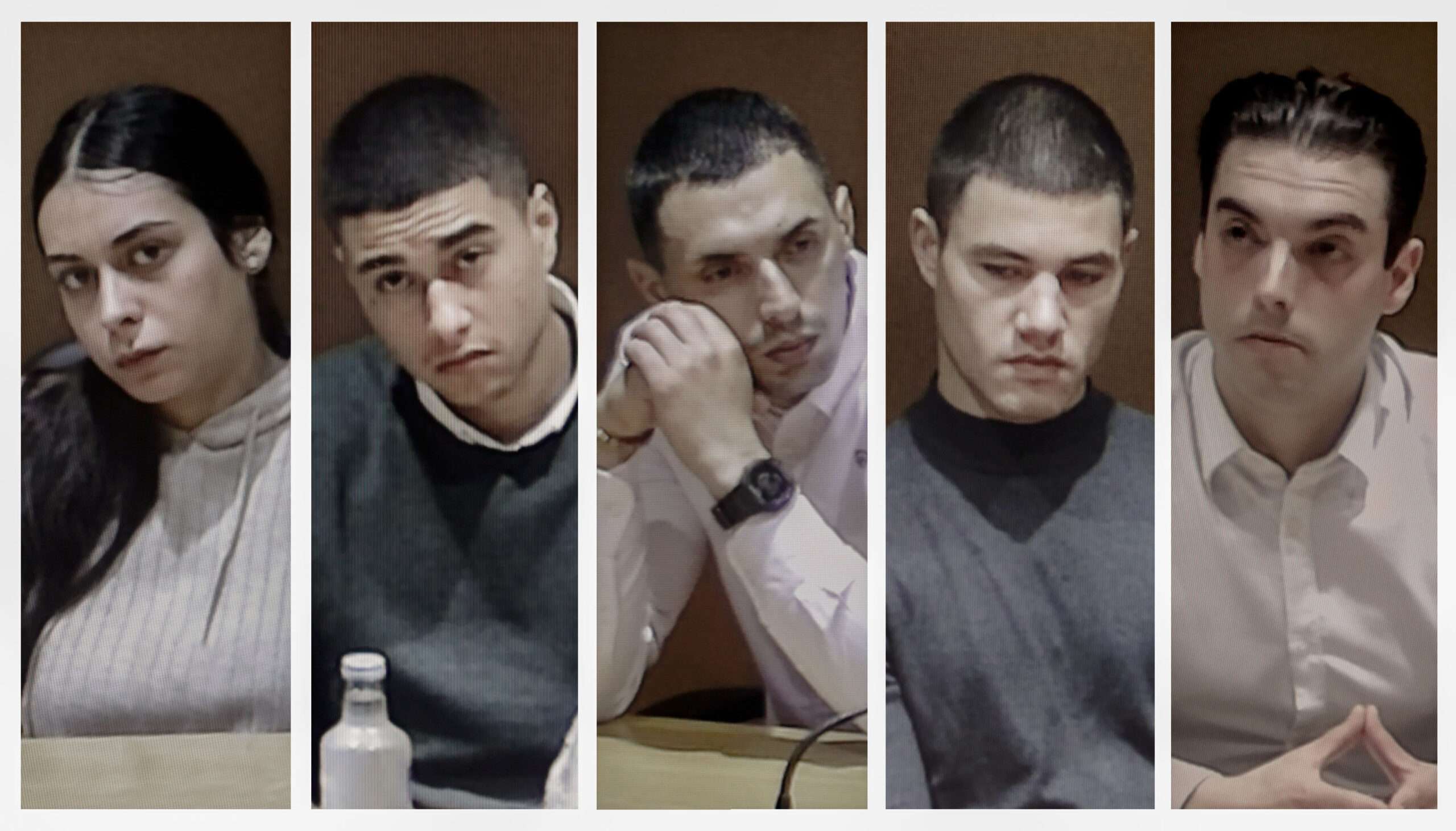 La Audiencia Provincial de A Coruña ha condenado con penas que van de los 20 a los 24 años de prisión a los tres adultos que asesinaron a Samuel Luiz y a 10 años a su cómplice, al tiempo que ha absuelto a la única mujer encausada. En las Imágenes de archivo, tomadas en la tercera semana de juicio a la pantalla en la que el TSXG suministraba a la sala de prensa la señal del juicio, de izquierda a derecha, los cinco acusados: Catherine "Katy" Silva (absuelta), Kaio Amaral (20 años y 6 meses) , Diego Montaña (24 años), Alejandro Freire "Yumba" (20 años) y Alejandro Míguez (10 años). Foto: EFE/Cabalar.