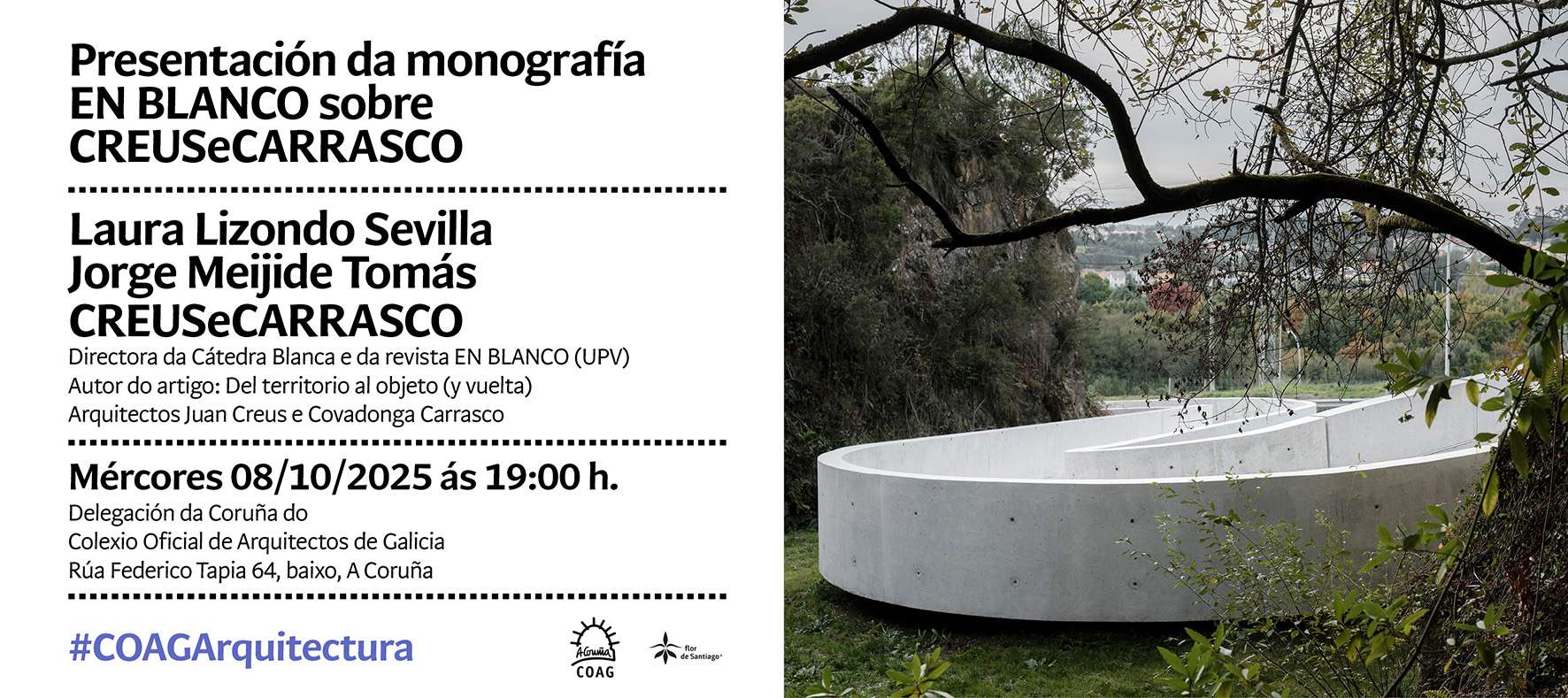 La jornada continuará a las 19:00 horas con la presentación del manual “EN BLANCO sobre CREUSeCARRASCO”, número 38 de la prestigiosa colección de la revista de arquitectura EN BLANCO, editada por la Universidad Politécnica de Valencia (UPV). El acto contará con la participación de Laura Lizondo Sevilla, directora de la Cátedra Blanca y de la revista EN BLANCO; Jorge Meijide Tomás, arquitecto y profesor de la ETSAC; y los protagonistas del volumen, Juan Creus y Covadonga Carrasco.