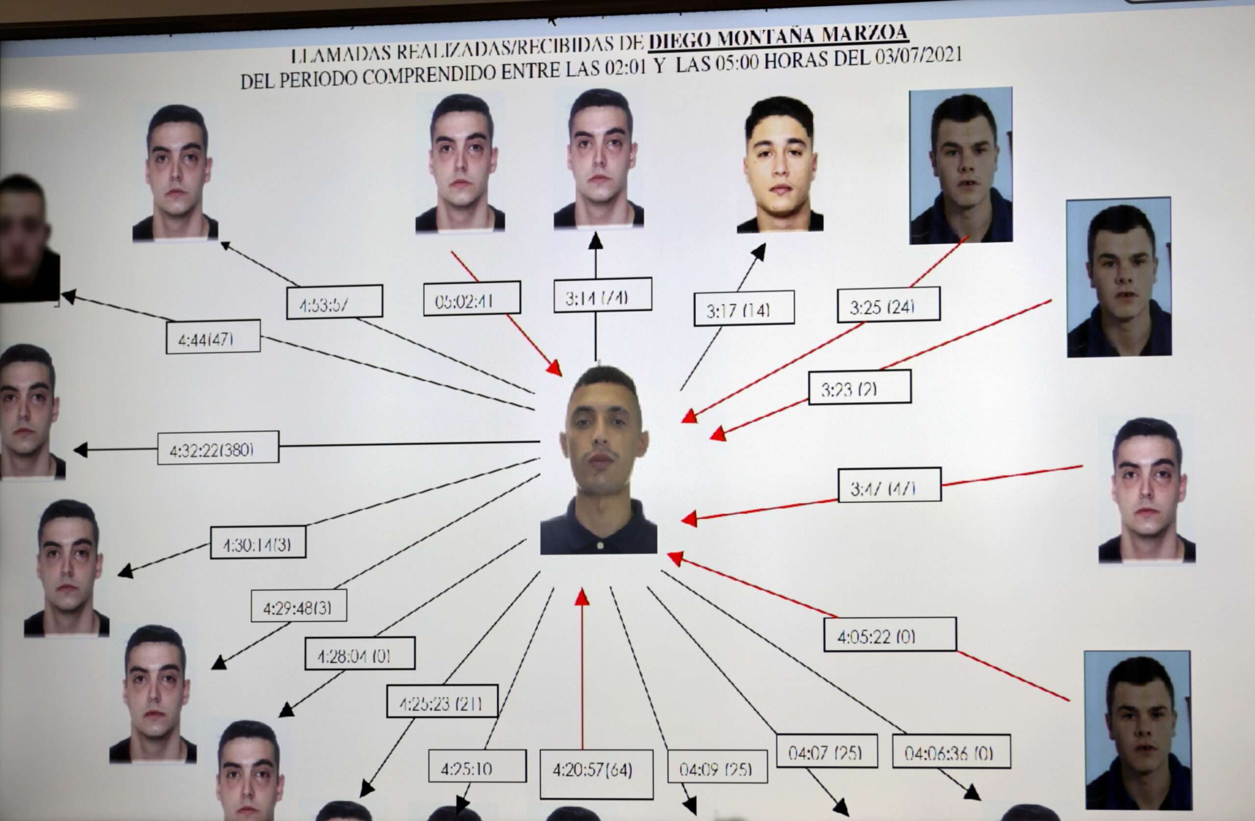 Fotografía tomada a la pantalla en la sala de prensa en la que aparece una prueba mostrada en la sesión de este martes, en la Audiencia Provincial de A Coruña, donde se observa el flujo de llamadas del teléfono del acusado Diego Montaña durante el juicio por el asesinato de Samuel Luiz en el que hay cinco acusados para los que la Fiscalía pide penas de entre 22 y 27 años de prisión al ver agravante de discriminación por orientación sexual. Foto: EFE/ Cabalar.