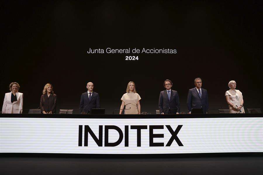 La presidenta de Inditex, Marta Ortega (c), acompañada por el consejero delegado de la multinacional, Óscar García Maceiras (3i), durante la Junta General de Accionistas que la cadena textil ha celebrado este martes en el concello coruñés de Arteixo. Foto: EFE