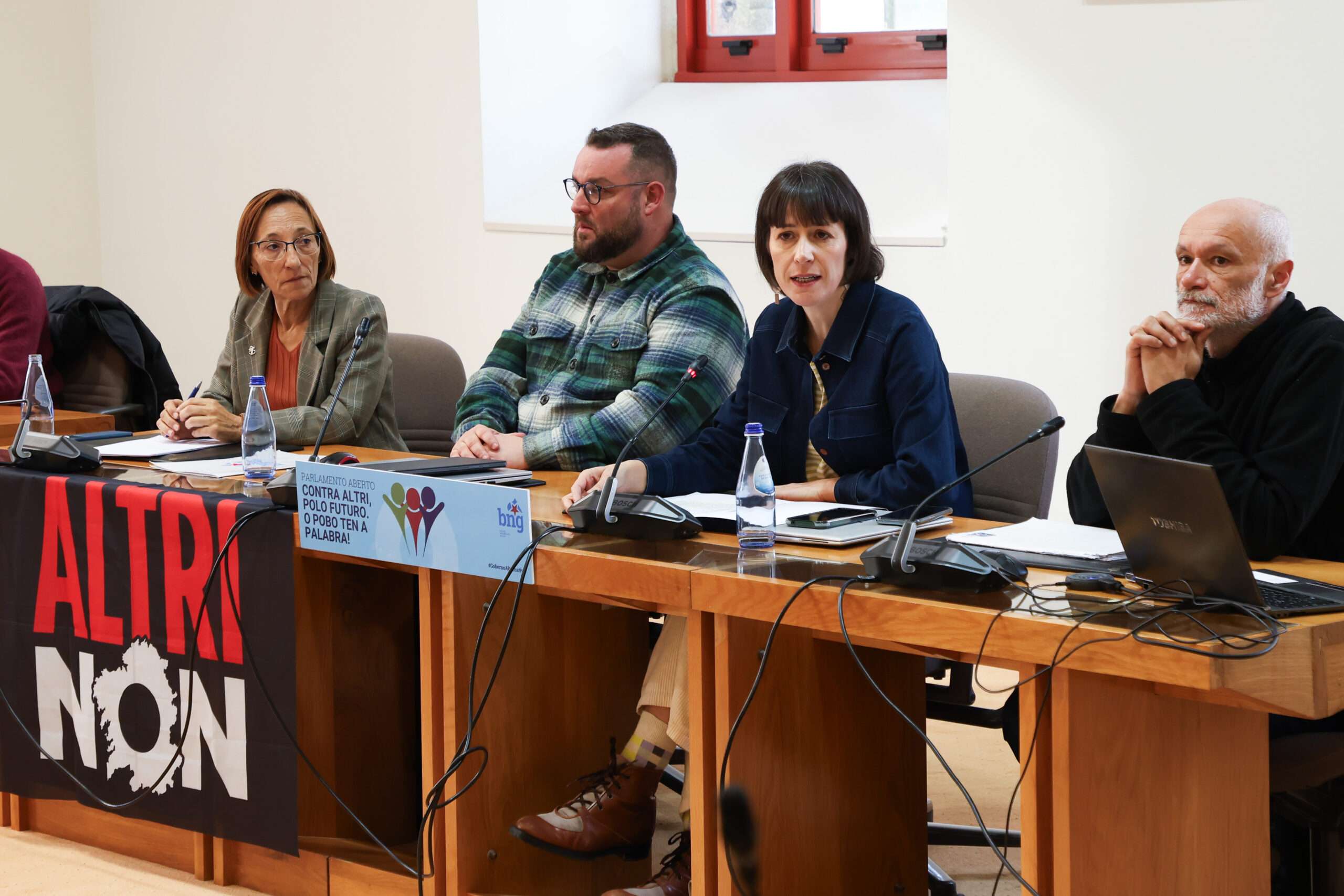 La portavoz Nacional del BNG, Ana Pontón (c) participó este sábado en una nueva edición de los encuentros Parlamento Aberto que, en esta ocasión, bajo el lema 'Contra Altri, polo futuro. O pobo ten a palabra' en donde se dió voz a los distintos colectivos afectados por la macrocelulosa proyectada por la multinacional lusa en el corazón del rural gallego. Foto: EFE/Xoán Rey.