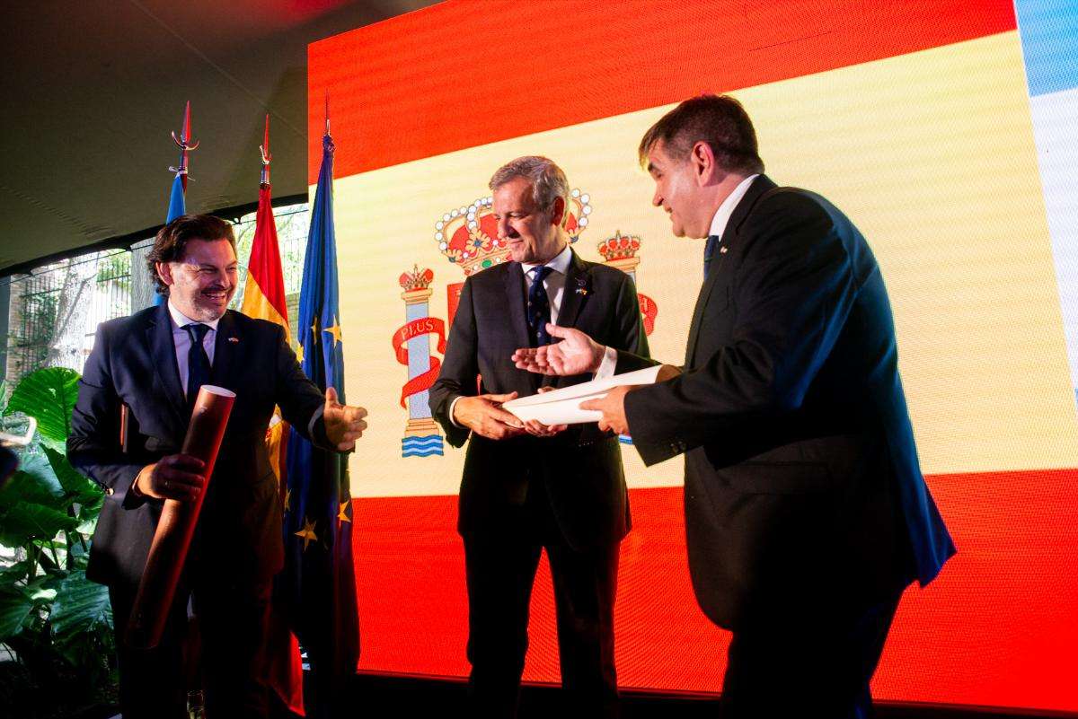 Acompañado por el conselleiro de Emprego, Comercio e Emigración, José González; el secretario xeral da Emigración, Antonio Rodríguez Miranda; y el delegado de la Xunta en Argentina, Alejandro López Dobarro, el presidente gallego agradeció la acogida del embajador y subrayó la importancia de la colectividad gallega en el país sudamericano. “España es un gran país porque se compone de muchas identidades diferentes que confluyen en una identidad nacional”, afirmó.