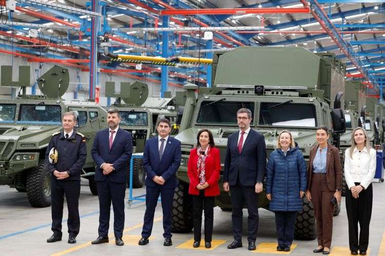 La ministra de Defensa, Margarita Robles (5d) posa junto al director general de Urovesa, Justo Sierra (4d) y el delegado del Gobierno, Pedro Blanco (3i), entre otros, durante su visita a las instalaciones de Urovesa y tras un recorrido supervisará la evolución de las capacidades fabriles, al igual que también presenciará una prueba dinámica de los vehículos VAMTA. EFE/ Lavandeira Jr
