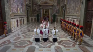 El momento culminante llegó cuando el maestro de ceremonias, Diego Ravelli, pronunció el solemne «Extra Omnes» (fuera todos), indicando la expulsión de cualquier persona ajena al cónclave y ordenando el cierre de las puertas. Los portones de madera, custodiados por guardias suizos con alabardas, se cerraron a las 17:46 horas, dejando a los cardenales en un aislamiento total.