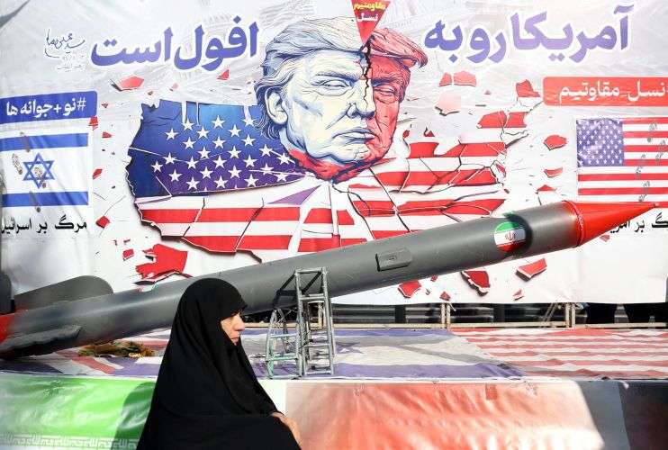 Una mujer iraní pasa junto a un misil falso y un dibujo del presidente de Estados Unidos, Donald Trump, durante una manifestación antiestadounidense para conmemorar el 46 aniversario de la toma de la embajada de Estados Unidos, en Teherán, Irán, el 4 de noviembre de 2025. EFE/EPA/ABEDIN TAHERKENAREH