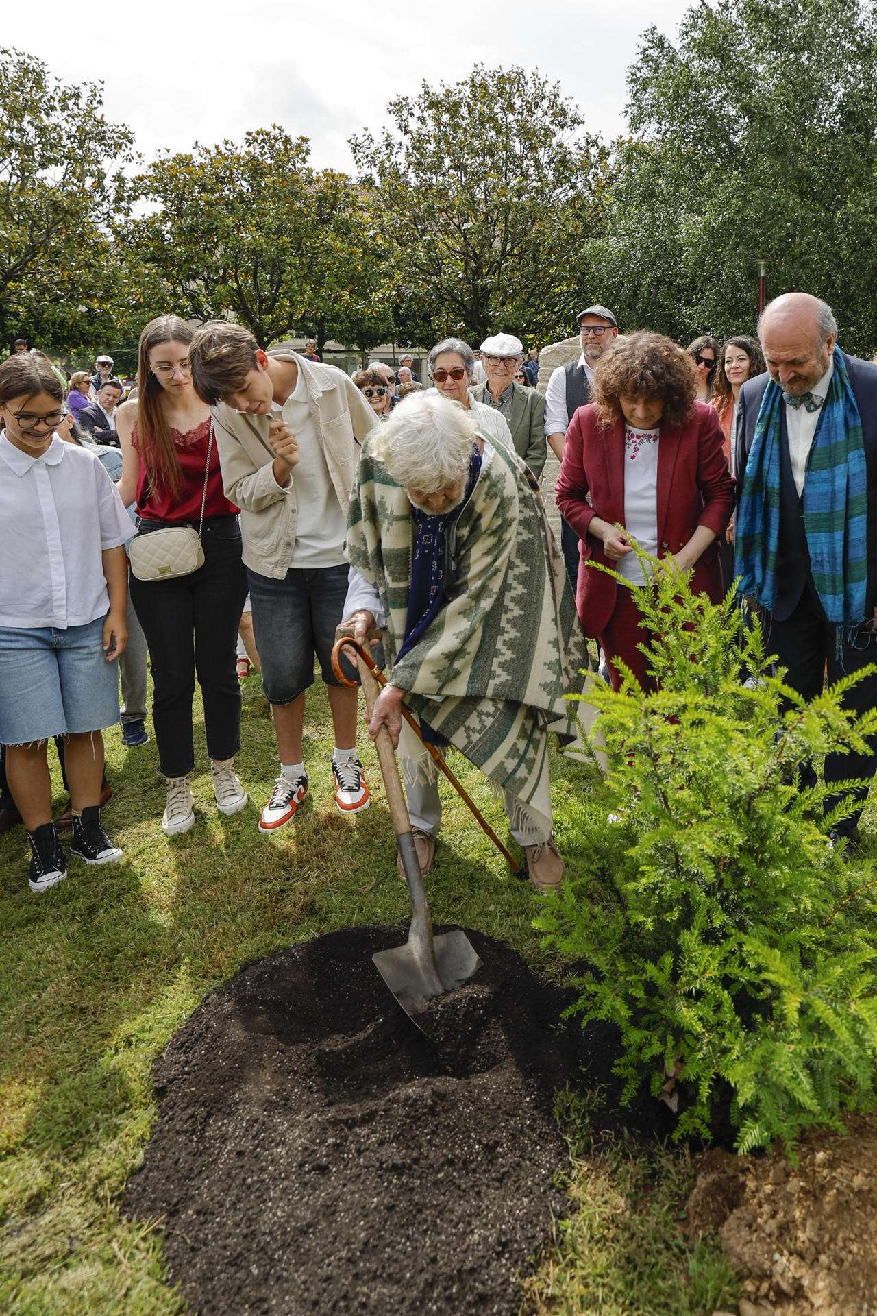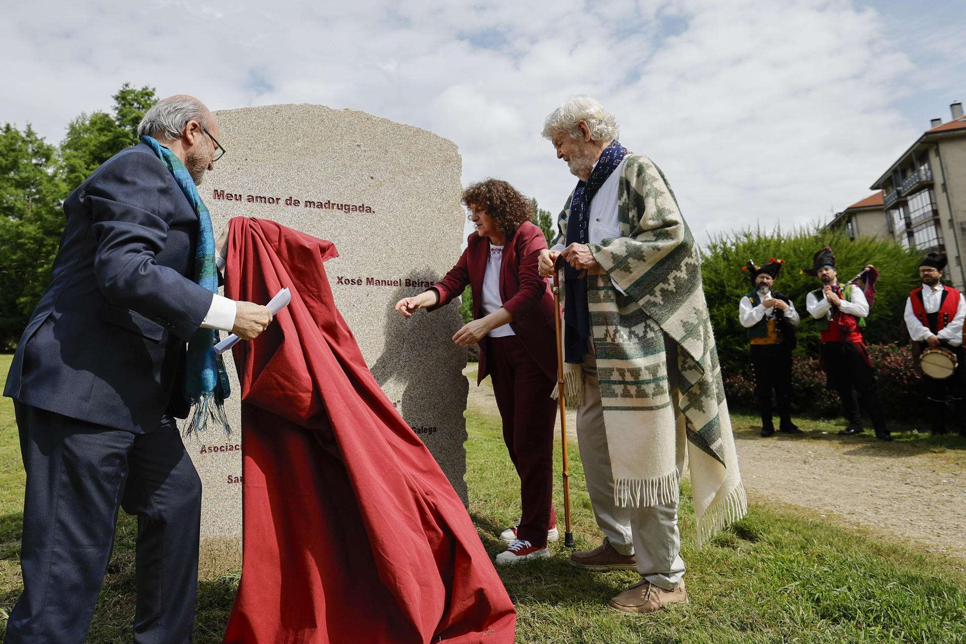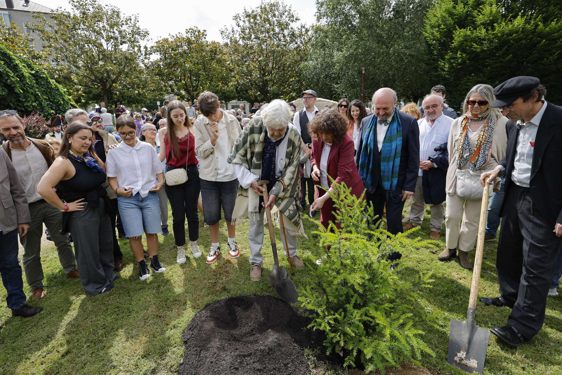 Tras descubrir el monolito con la inscripción «Meu amor de madrugada», los asistentes y el homenajeado plantaron un tejo en el Parque de Galeras, un espacio que confesó «tiene recuerdos remotos para él» ya que, de niño, solía caminar por él con sus hermanos.