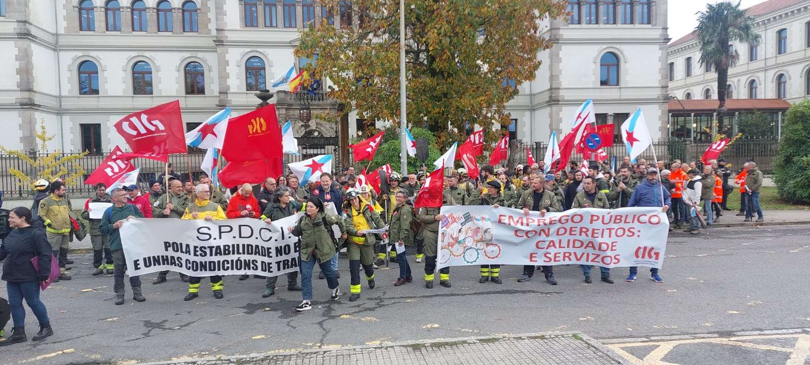La protesta, convocada por la CIG, reclamó un servicio de extinción de incendios totalmente público y profesionalizado, con igualdad de condiciones laborales y salariales, ampliación de la duración de los contratos y garantías de salud y seguridad.