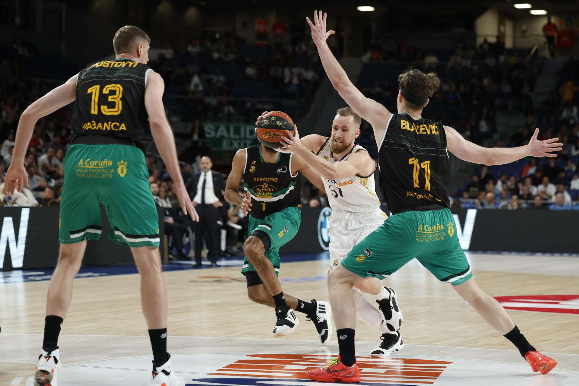El jugador del Real Madrid Dzanan Musa, con el balón, rodeado por tres jugadores del Monbus Obradoiro, este domingo, en Madrid.-EFE/ Mariscal