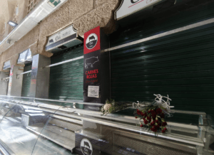 Así se encuentra el puesto de la Plaza de Abastos de Antonio Costa, con ramos de flores honrando su memoria. Foto: DS