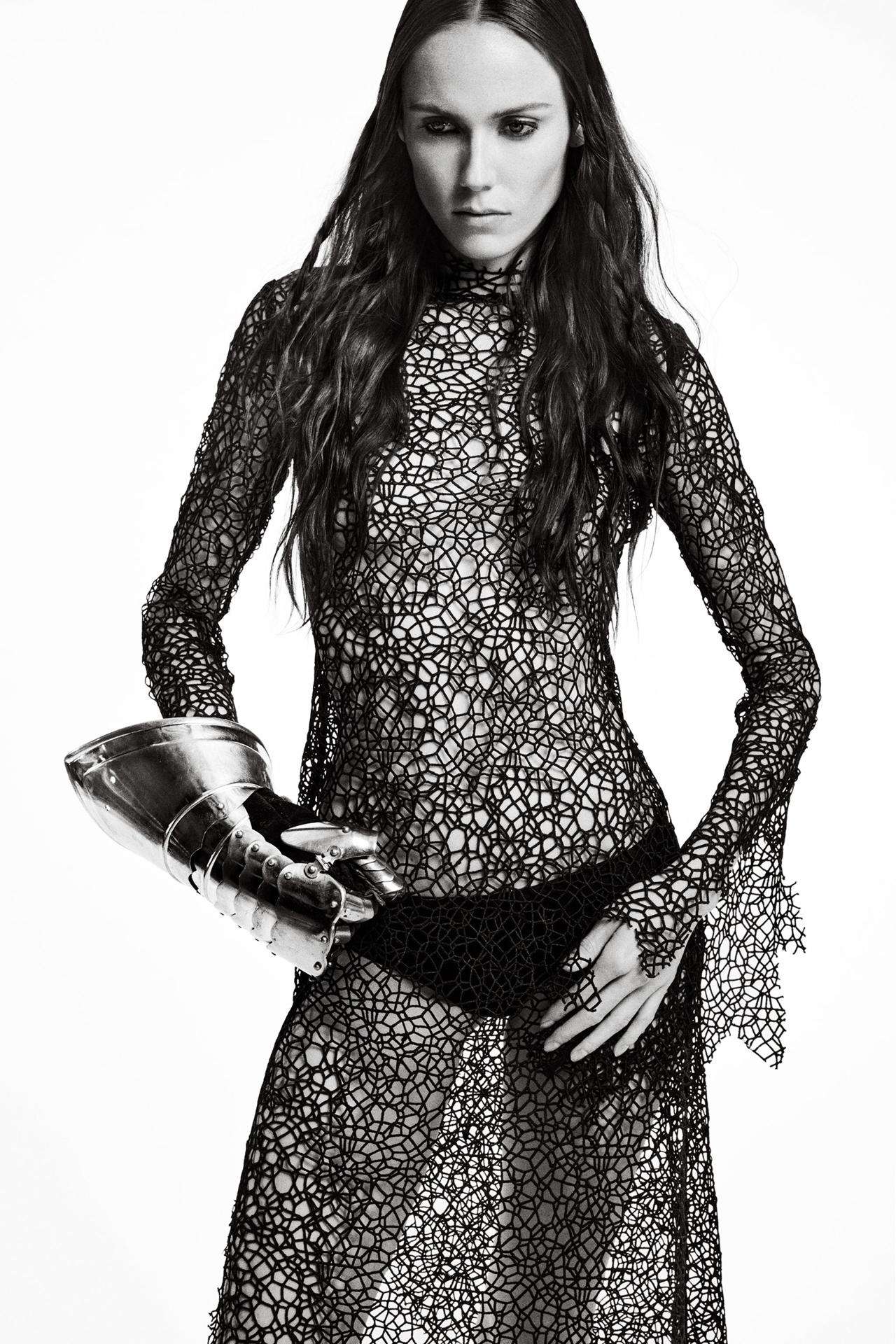 Otros de los modelos que propone es un vestido negro de largo midi y corte asimétrico hecho en un tejido con efecto tela de araña.